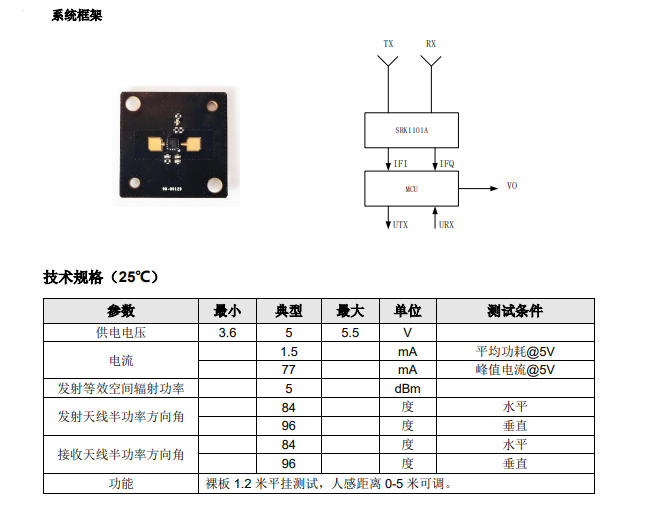 This system utilizes the frequency difference between electromagnetic wave transmission and reception signals to detect the distance of moving targets. The 24GHz electromagnetic wave signal is emitted by the transmitting antenna. When encountering a moving object at a certain distance, the electromagnetic wave signal will reflect back to the 24GHz electromagnetic wave signal with a certain delay. The reflected signal is received by the receiving antenna, and the intermediate frequency signal with the target distance signal is obtained by mixing the received signal and the transmitting signal. Calculation and analysis of this intermediate frequency signal can obtain the distance information of the moving object. When a moving object is detected, a low level is output, and when there is no moving object, a high level is output.