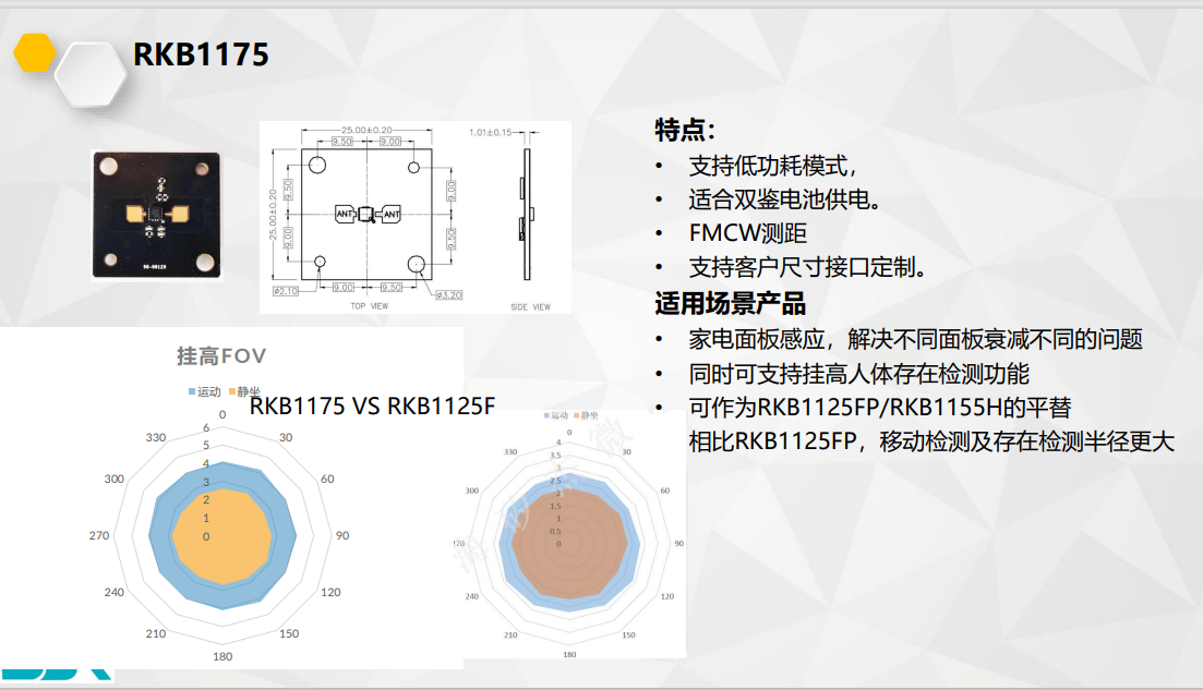 RKB1175 is an IoT radar module designed based on Shanghai SGR Microelectronics 24G radar chip SRK1101, which can be applied in the fields of home appliances, lighting, industry, and other IoT fields.